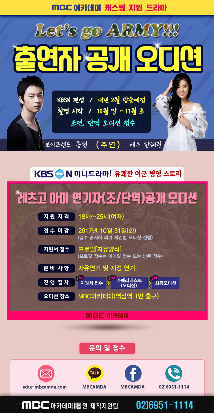 KBSN 편성 확정 : 2018년 2월 방송 예정인 보이프렌드(동현), 배우 한혜린외 다수의 걸그룹 출신 배우들이 출연하는 유쾌한 여군 병영 스토리 '렛츠고아미' 주요 배역 연기자(조/단역) 공개 오디션 접수 중입니다.